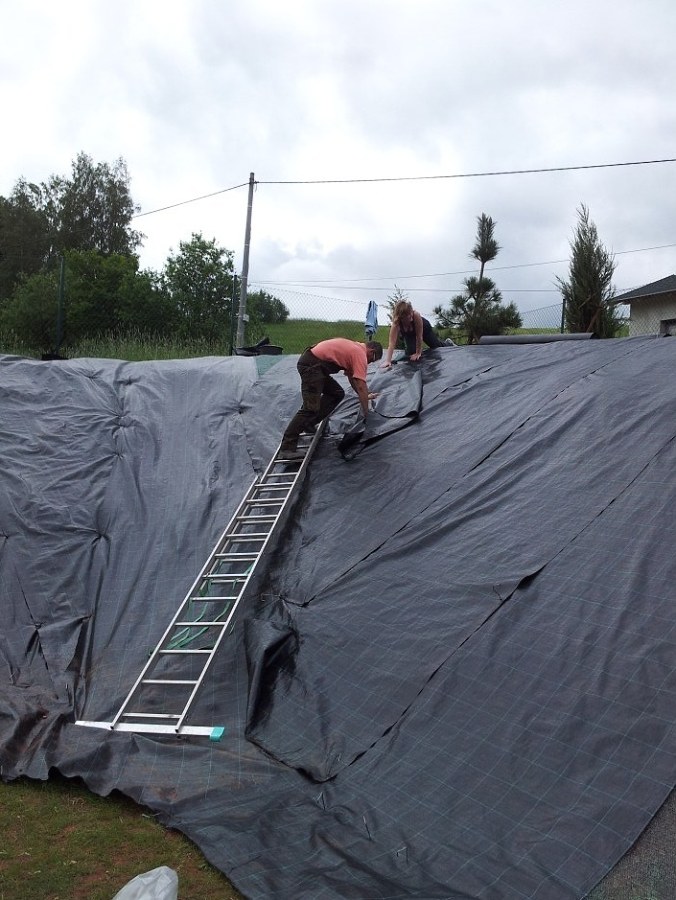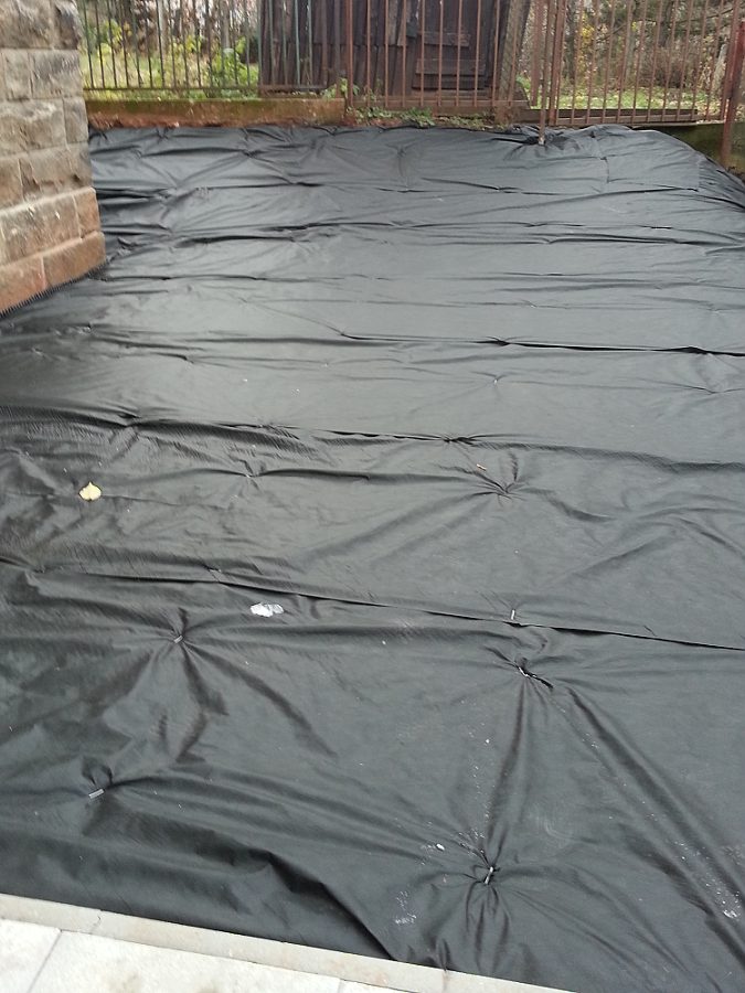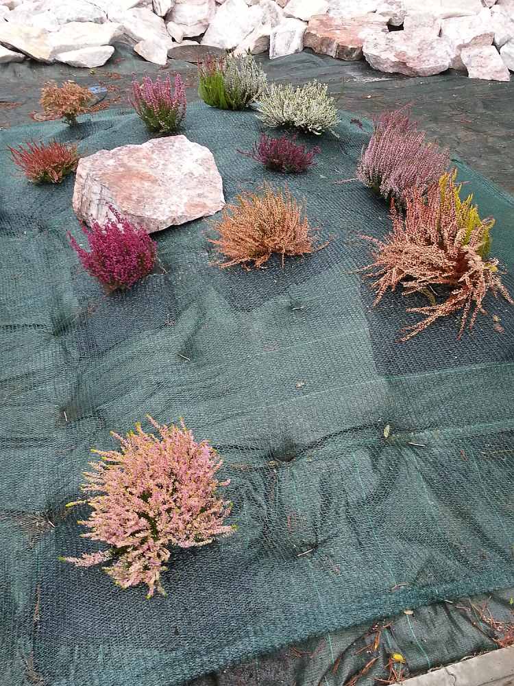 - Celý budoucí okrasný záhon zakryjte mulčovací netkanou textilií v roli, nebo mulčovací netkanou textilií v balíčkách, pouze na pochůzné svahy umístěte pevnější mulčovací tkanou textilii v roli, nebo mulčovací tkanou textilií v balíčkách. Vzájemný přesah jednotlivých pruhů musí být minimálně 10 cm. K ukotvení textilií použijte ocelové pozinkované kotvicí skoby, nebo plastové skoby a to cca. po 0,5 metrech tak, aby se textilie v nerovných místech dotýkaly země. Tím zabráníte nechtěnému protržení textilie při následném pohybu po ní.