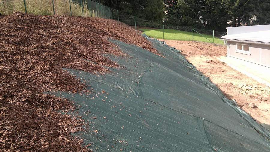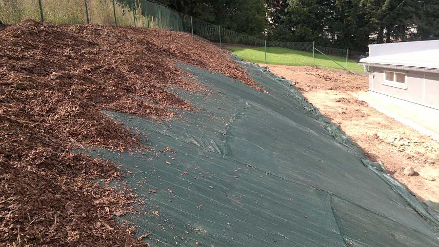 - Při pokládání mulčovací kůry na svahy pokryté mulčovací netkanou i tkanou textilií nezapomeňte na stabilizační 40% rašlový úplet. Při jeho položení na netkané i tkané textilie a ukotvení stabilizačními kotvícími skobami ocelovými pozinkovanými nebo skobami plastovými zůstane mulčovací kůra na svém místě a ani za prudkého deště nebude docházet k jejím splavování.