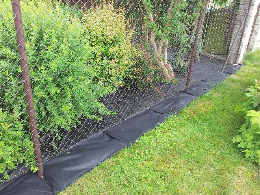 Nezapomeňte na 10 cm přesah textilie u obrubníků nebo u betonového základu plotu. Pečlivě tuto přesahující textilii zastrkejte (např. zednickou lžící) těsně k obrubníku tak, aby mezi obrubníkem a textilií nebyla žádné zemina. U plotu se snažte položením textilie pod pletivo zabránit tomu, aby jím plevel prorostl. Nezpevněné konce textilií několikrát přeložte a ukotvěte skobami. Nebo pod plot použijte tkanou mulčovací textilii o šířce 40 cm nebo tkanou mulčovací textilii o šířce 60 cm v 100 metrové roli.