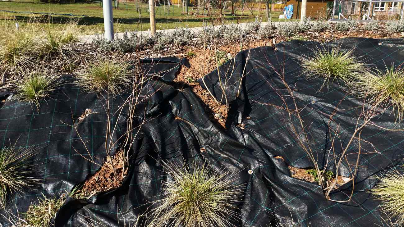 - Před položením mulčovacích materiálů, kterých dávejte jen tenkou vrstvu, pečlivě a důsledně z textilií odstraňte případnou zeminu po výsadbě, např. zahradním fukarem.